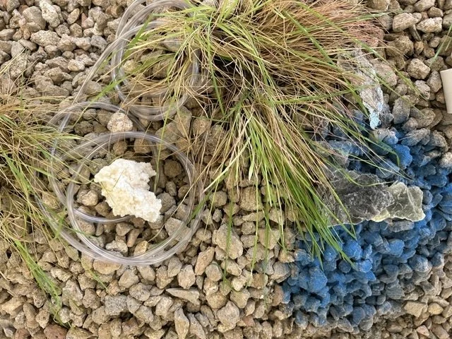Recycled Aggregate, watercolour painting, wheat grass, vinyl tubing, coated wires, painted ducting, rubber hose, PVC pipe fittings, rock crystal, brown dolomite, rose quartz, muscovite mica, aragonite groups, talc, halite, blue sand